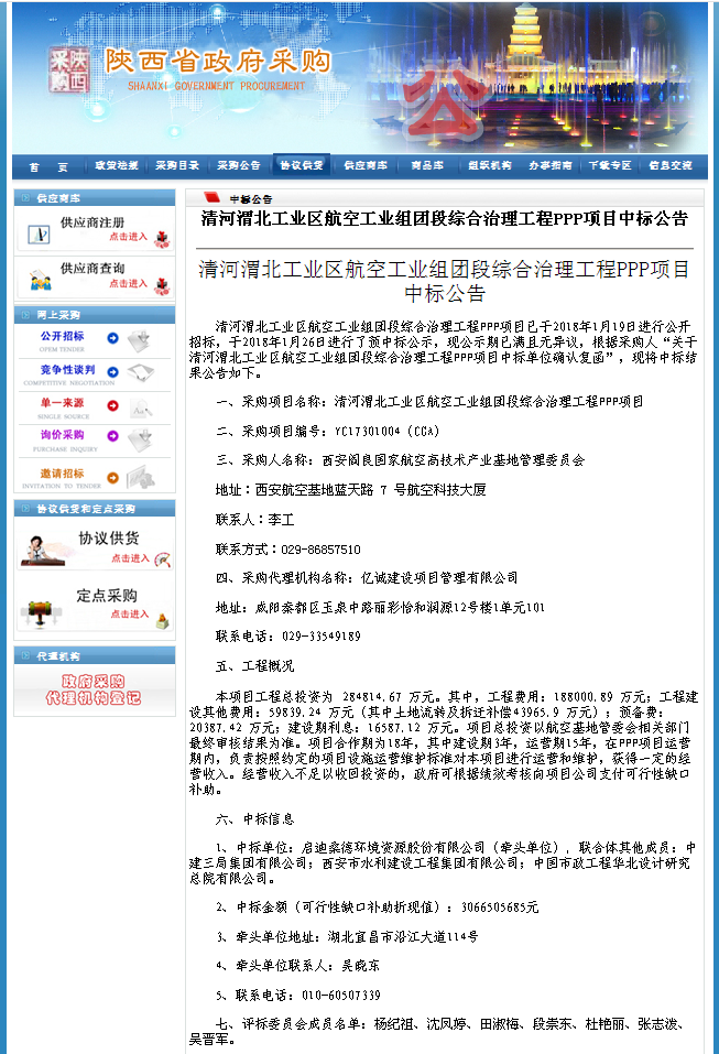 清河渭北工業(yè)區(qū)航空工業(yè)組團(tuán)段綜合治理PPP項(xiàng)目于2018119日進(jìn)行公開招標(biāo),經(jīng)評標(biāo)委員會評審,推薦以啟迪桑德環(huán)境資源股份有限公司牽頭,與中建三局集團(tuán)有限公司、西安市水利建設(shè)工程集團(tuán)有限公司、中國市政工程華北設(shè)計(jì)研究總院有限公司組成的聯(lián)合體中標(biāo)。