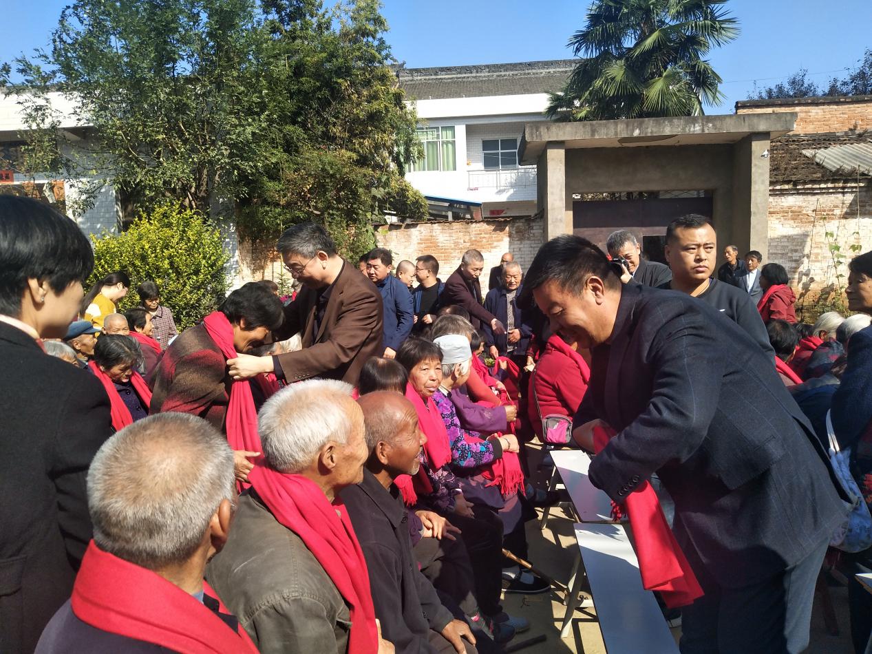 接下來,市水務(wù)局副局長劉博和公司董事長王長隨為村里的老人們佩戴紅圍巾。暖暖的紅圍巾,滿滿的民生情。戴著滿載孝意的紅圍巾,老人們臉上洋溢著笑容,倍感溫馨。